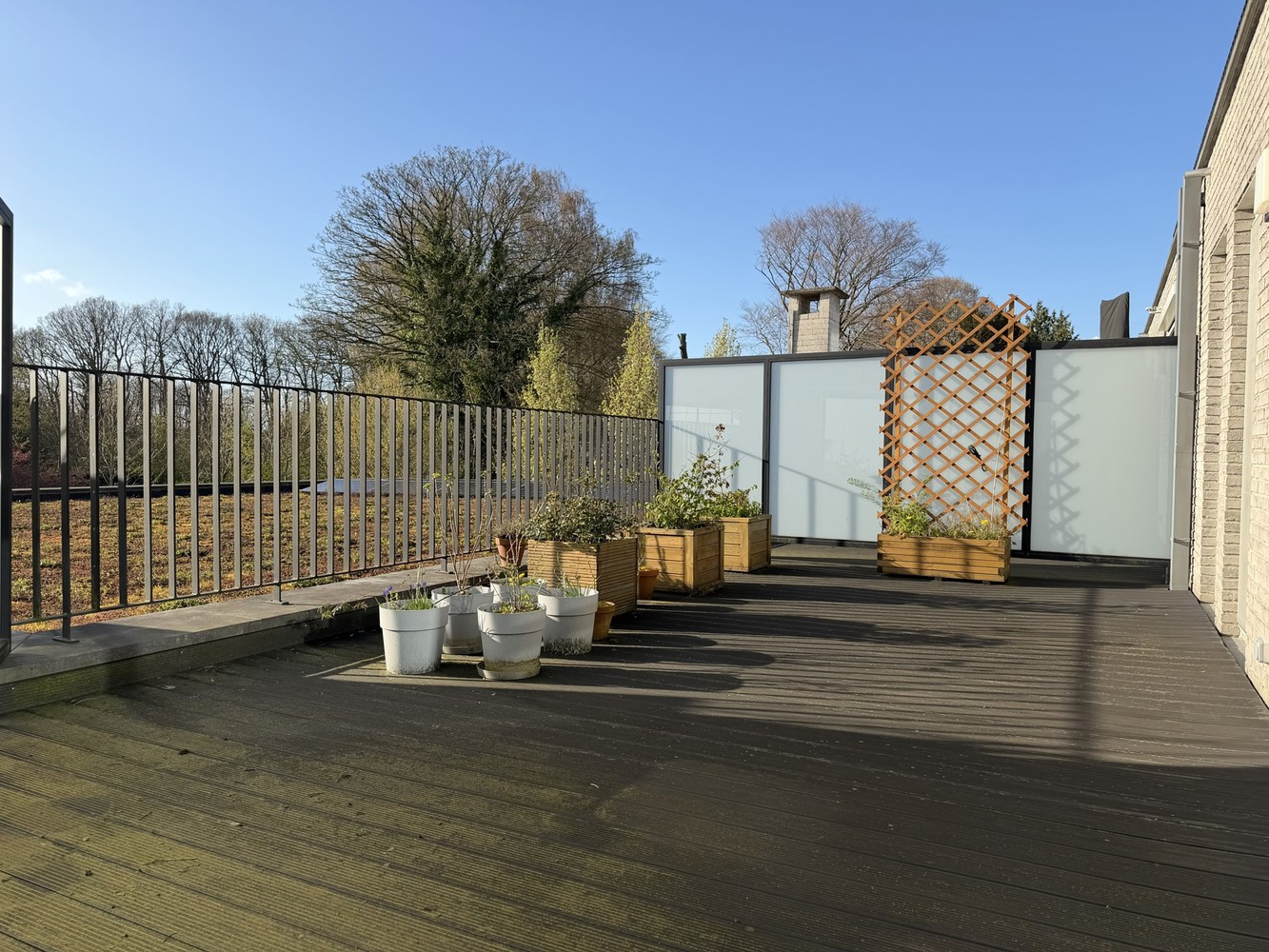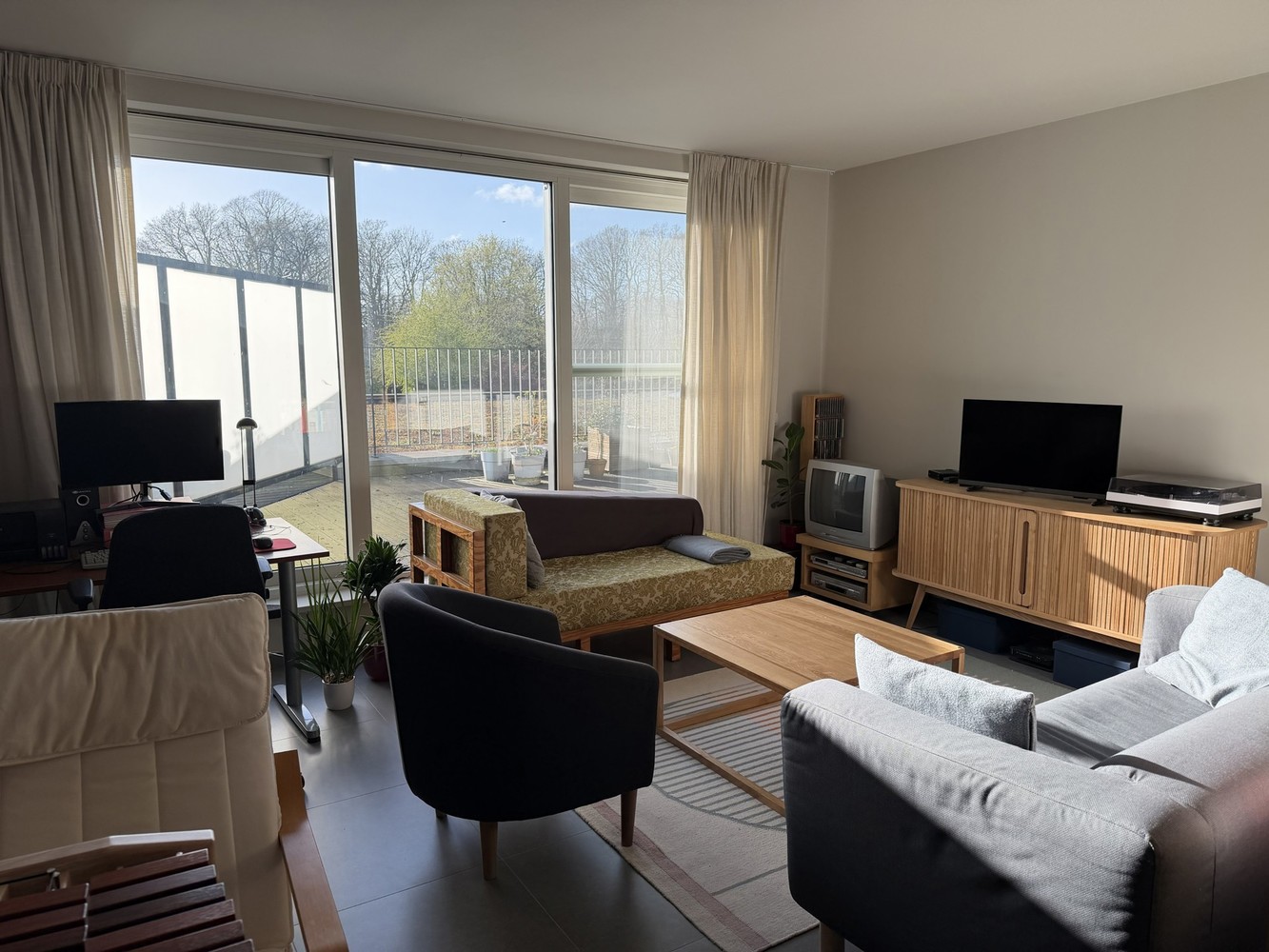 - Lichte woonkamer (ca 35m²) met een groot schuifraam dat uitgeeft op tot het grote terras (ca 29m²)