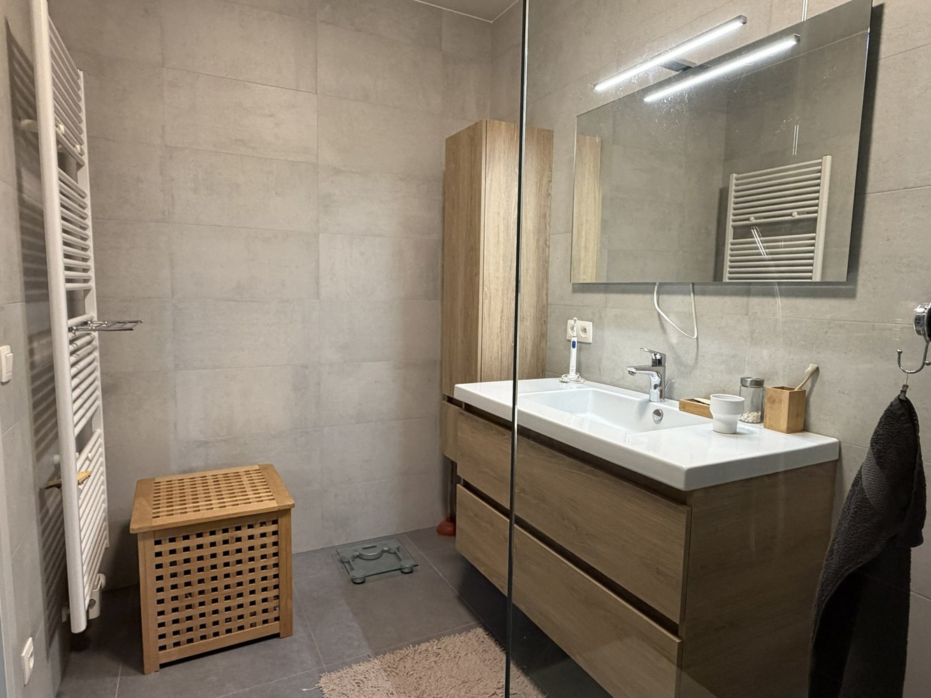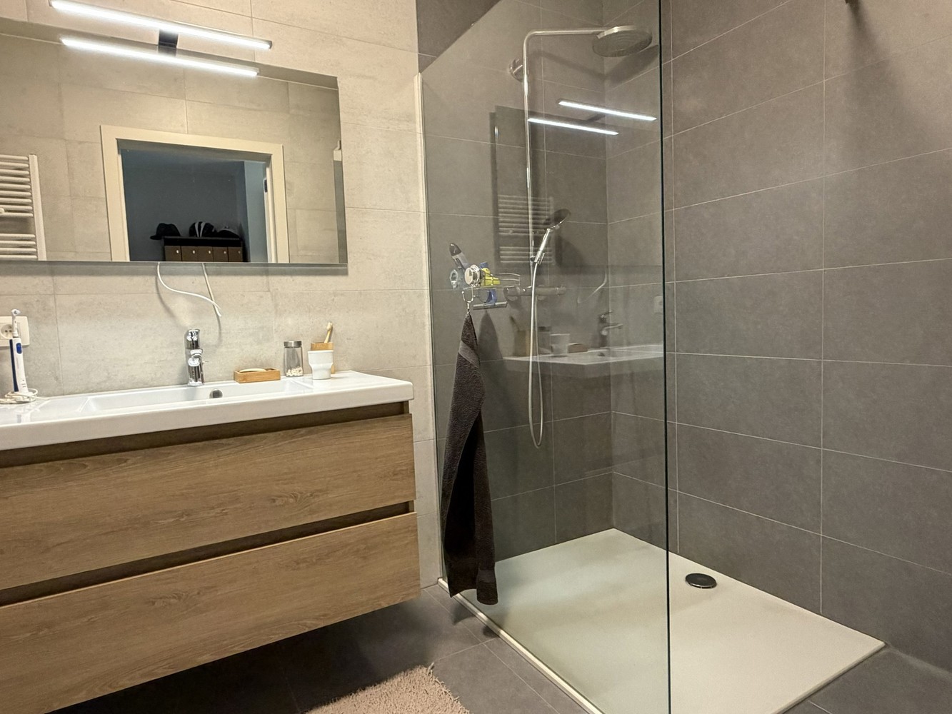 - Mooi ingerichte badkamer ingericht met meubel met lavabo, spiegel en inloopdouche