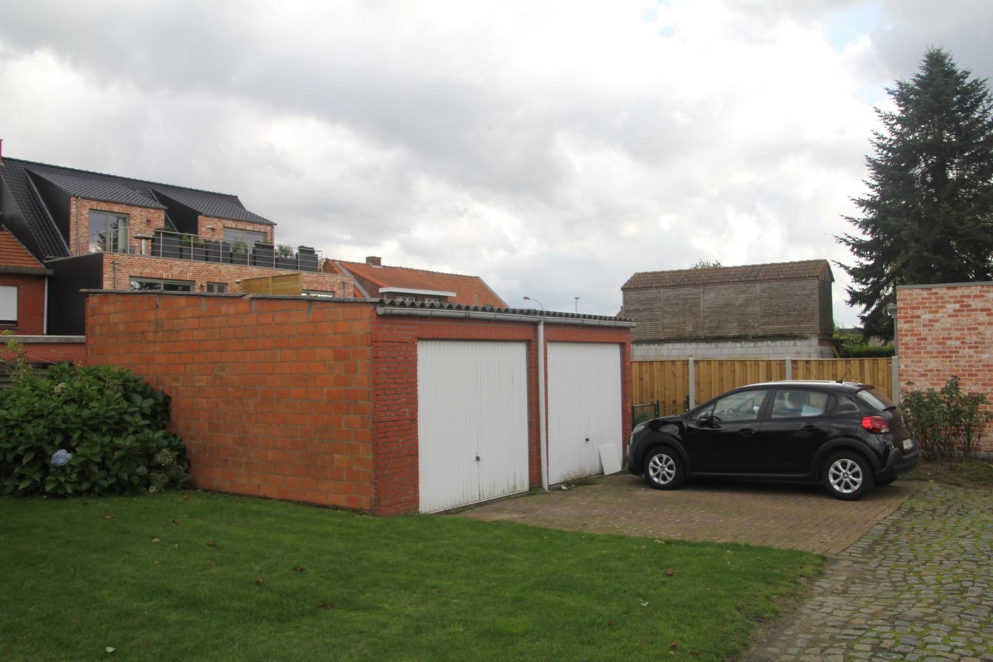 - Uitpandige garage achteraan in de tuin, bereikbaar via servitudeweg rechts van de woning