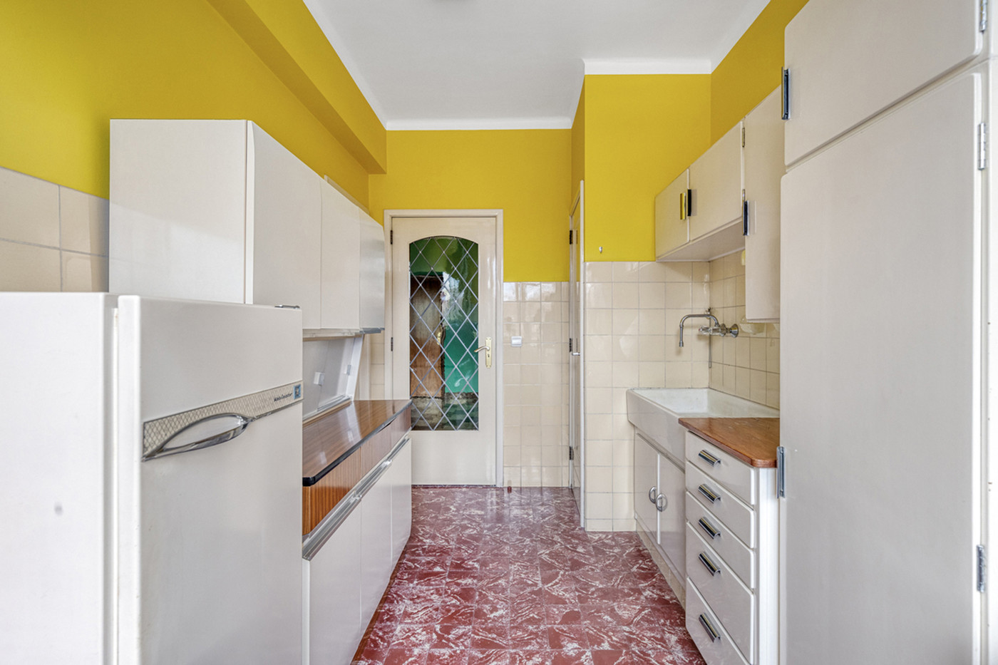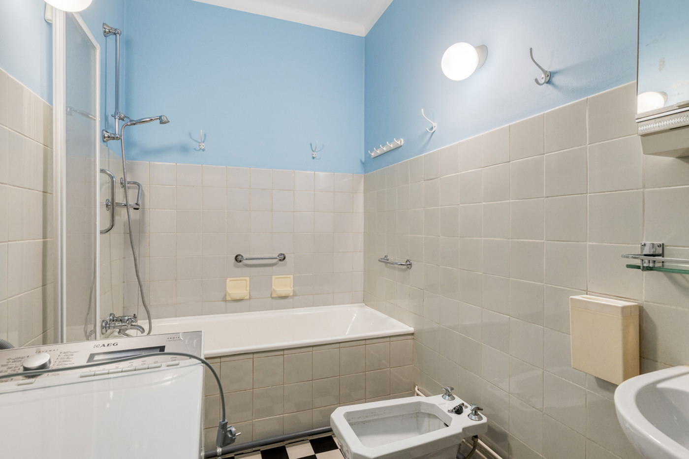 - badkamer (originele inrichting) met ligbad met douchescherm, lavabo, bidet en aansluitingen voor was-en droogautomaat